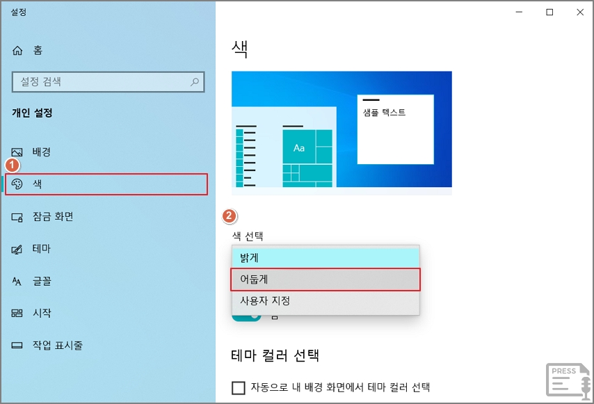 설정화면이 나옵니다. 개인설정에서 색을 클릭합니다. 그러면 오른쪽에 색 선택을 하는 화면이 보여집니다. 여기에서 색 선택을 "어둡게"로 변경하면 됩니다. 기본은 "밝게" 입니다.