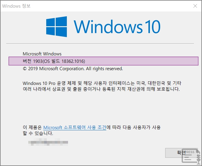 버전을 확인할 수 있습니다. 버전 1903(OS 빌드 18362.1016) 이라고 나옵니다. 참고로 사용하고 있는 것은 윈도우 10 Pro 입니다. 최근에 윈도우 업데이트를 했습니다. 아마도 현재 가장 최신버전으로 알고 있습니다.