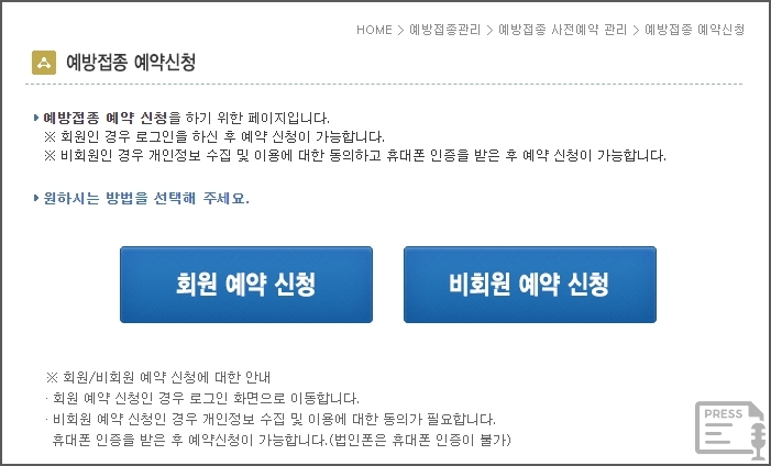 예방접종 예약신청은 회원, 비원회 모두 가능합니다. 비회원의 경우는 휴대폰 인증 후 예약 신청이 가능합니다.