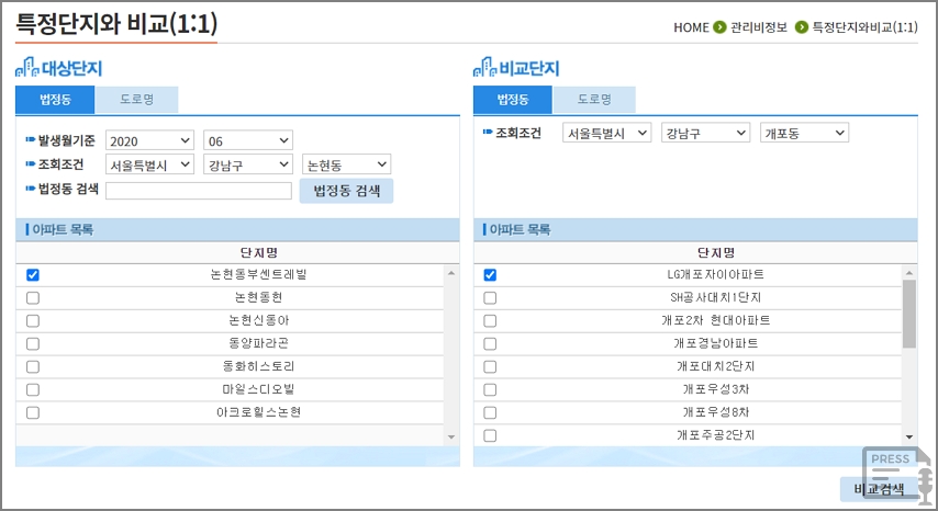 대상단지와 비교단지를 선택하세요. LG개포자이아파트와 비교를 해보았습니다.