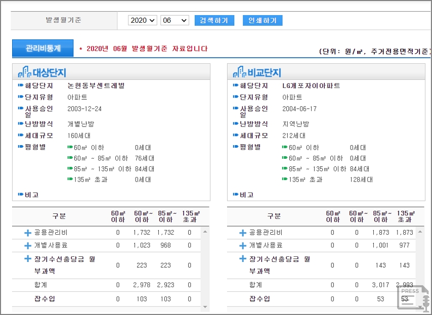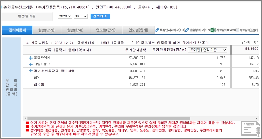 실제 살고 있는 아파트는 아니지만 논현동부센트레빌 관리비를 조회해봤습니다. 논현동부센트레빌의 2003년에 지어진 아파트로 160세대수가 있는 단지 입니다. 단위면적당 공용관리비가 1732원 정도됩니다. 개별사용료, 장기수선충당금 등을 포함하면 2946원 정도가 됩니다. 실제 부과되는 세대별 관리비와는 차이는 있을 수 있습니다.