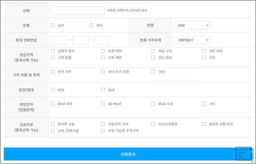 성명, 성별, 연력, 휴대전화번호, 현재 거주지역, 관심지역 등을 선택하고 신청하면 바로 가입이 됩니다. 아주 간단합니다. 3기 신도시에 관심이 있는 분들, 아직 서비스에 가입하지 않았다면 지금 바로 해보세요.