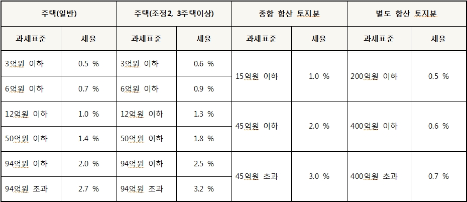 과세표준에 따라 세율이 정해집니다. 과세표준이 커질수록 납부하는 세율도 커지게 됩니다. 주택의 경우 과세표준이 3억원이하의 경우는 0.5%, 6억원 이하는 0.7%, 12억원 이하는 1.0%, 50억원 이하는 1.4%, 94억원 이하는 2.0%, 94억원 초과는 2.7%입니다.