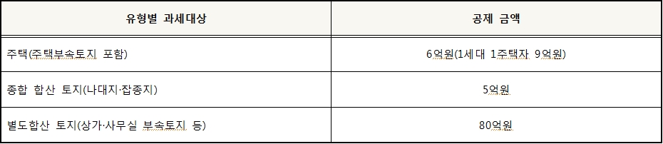 먼저 유형별 과세대상 및 공제가 되는 금액입니다. 주택의 경우 공제금액은 6억원 입니다. 1세대 1주택자의 경우는 9억원까지 공제가 됩니다. 종합합산토지는 5억원까지, 별도합산토지는 80억원까지 공제가 됩니다. 해당 금액을 초과하는 과세대상의 경우 종부세 과세대상이 됩니다.