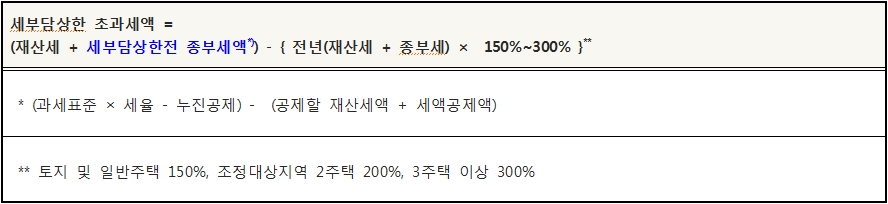 전년도에 부과된 종부세대비 너무 많은 금액이 부과되는 것을 방지하기 위해 상한을 두고 있습니다. 전년도 보다 100분의 300을 초과하는 경우, 300%가 넘는 경우 그 금액은 없는 것으로 합니다.