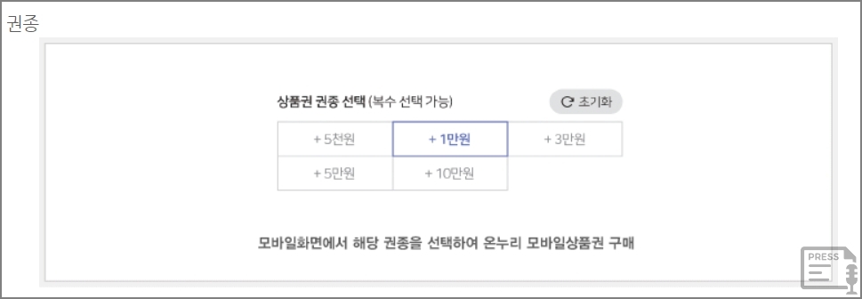 모바일상품권은 조금 더 다양한 권종을 선택할 수 있습니다. 5천원, 1만원, 3만원, 5만원, 10만원권 등을 선택하여 구매를 할 수 있습니다.