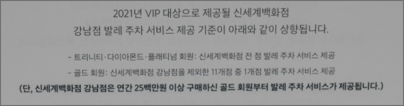 마지막으로, 최고 등급인 트리니티는 매년 구매 금액 최상위 999명을 선정하여 서비스를 제공합니다. 그리고 2021년 VIP 부터 신세계백화점 강남점 발레 주차 서비스 제공 기준이 상향이 됩니다. 연간 2500백만원 이상 구매한 골드 등급부터 발레주차 서비스가 제공이 됩니다. 이 부분은 바뀌는 부분이므로 꼭 확인하세요.