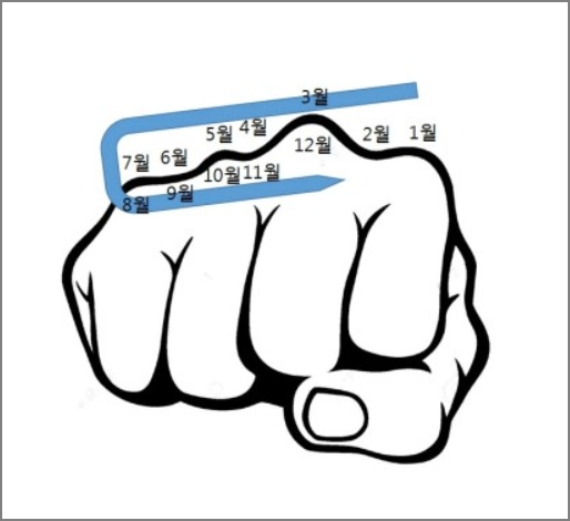 다 외우면 되겠지만, 가끔 헷갈릴 수도 있습니다. 자신의 주먹으로 간단하게 월별일수를 셀 수가 있습니다.