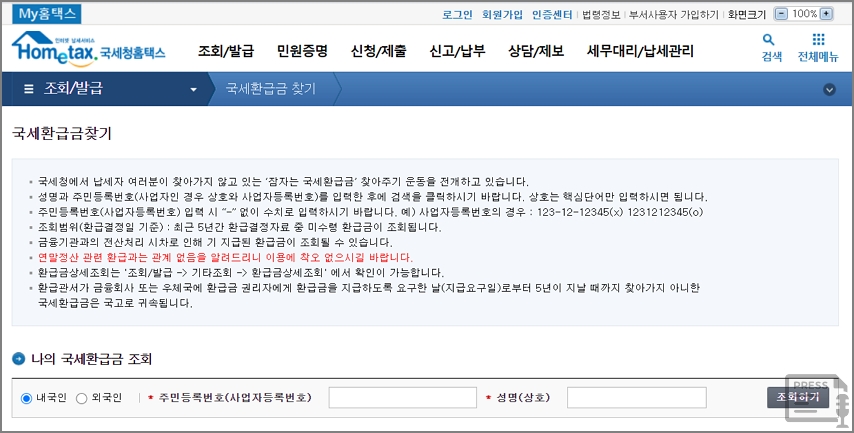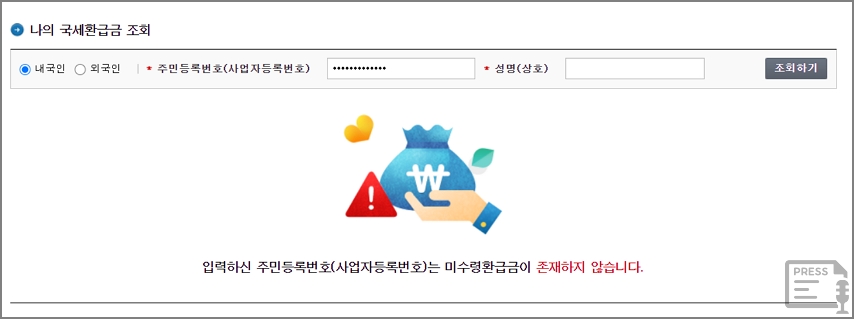 주민등록번호와 이름을 입력한 후 검색을 하면 됩니다. 사업자인 경우에는 사업자등록번호를 입력하면 됩니다. 최근 5년간 미수령 환급금이 조회기 됩니다. 연말정산 관련 환급과는 상관이 없습니다.