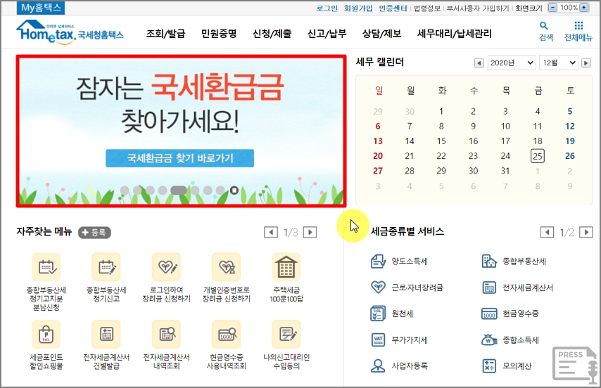 홈택스에서 "잠자는 국세환급금 찾아가세요" 메뉴를 클릭합니다. 또는 "조회/발급 > 기타 조회/발급 > 국세환급금 찾기" 메뉴로도 조회가 가능합니다.
