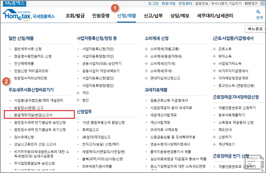 국세청 홈택스 홈페이지에서 직접 계좌를 입력하면 됩니다. "신청/제출 > 주요세무서류신청바로가기 > 환급계좌개설(변경)신고서" 메뉴를 클릭합니다. 여기에서 로그인 후 계좌를 개설하면 됩니다.