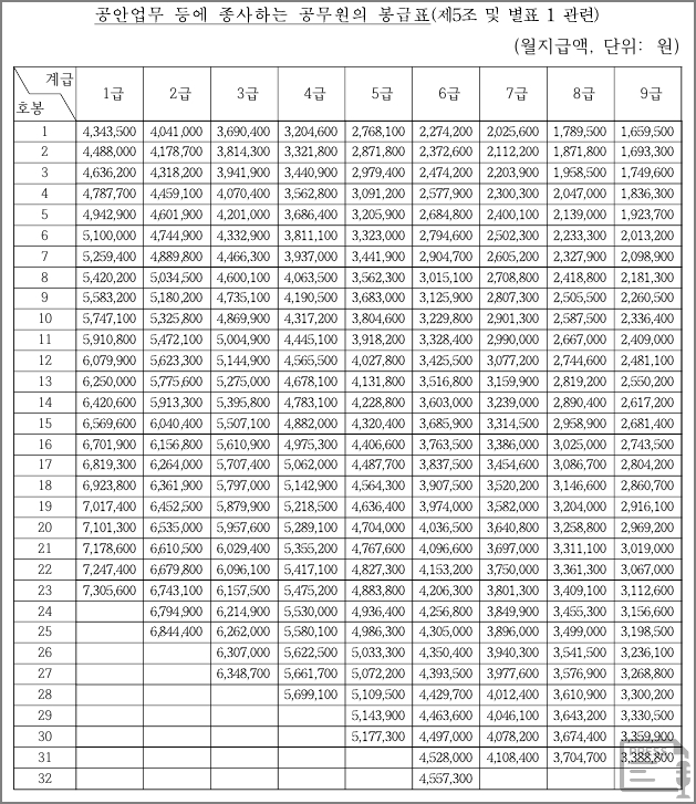 공안업무 등에 종사하는 공무원의 2021년 봉급표입니다.