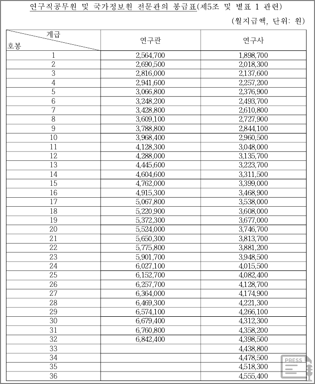 연구직공무원 및 국가정보원 전문관의 공급표입니다. 연구직공무원 등은 연구관과 연구사 계급이 있습니다.