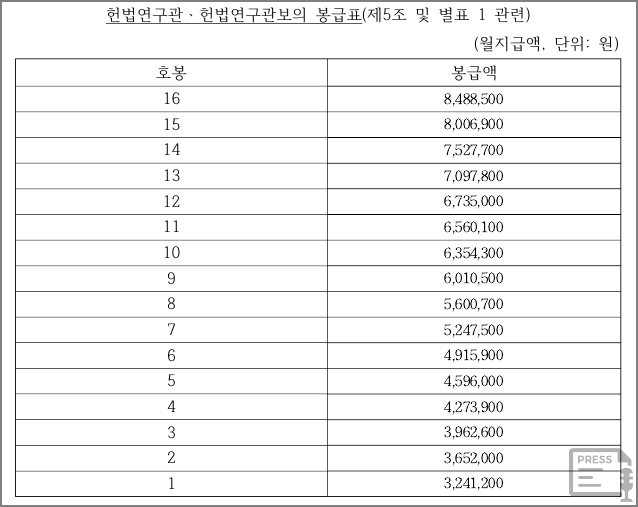 헌법연구관, 헌법연구관보의 봉급표입니다. 1호봉부터 16호봉까지 있습니다.