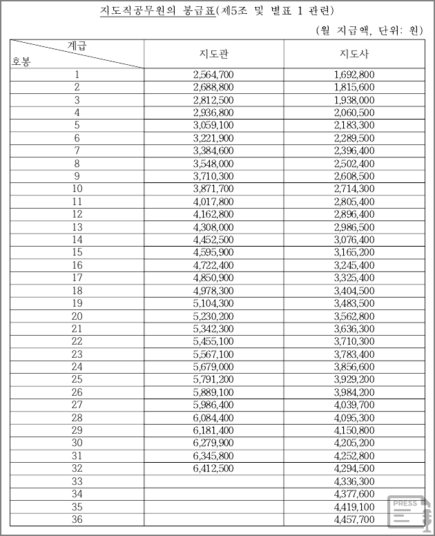 2021년 지도직공무원의 봉급표입니다. 지도관 계급과 지도사 계급에 따라 봉급 지급액이 다릅니다.
