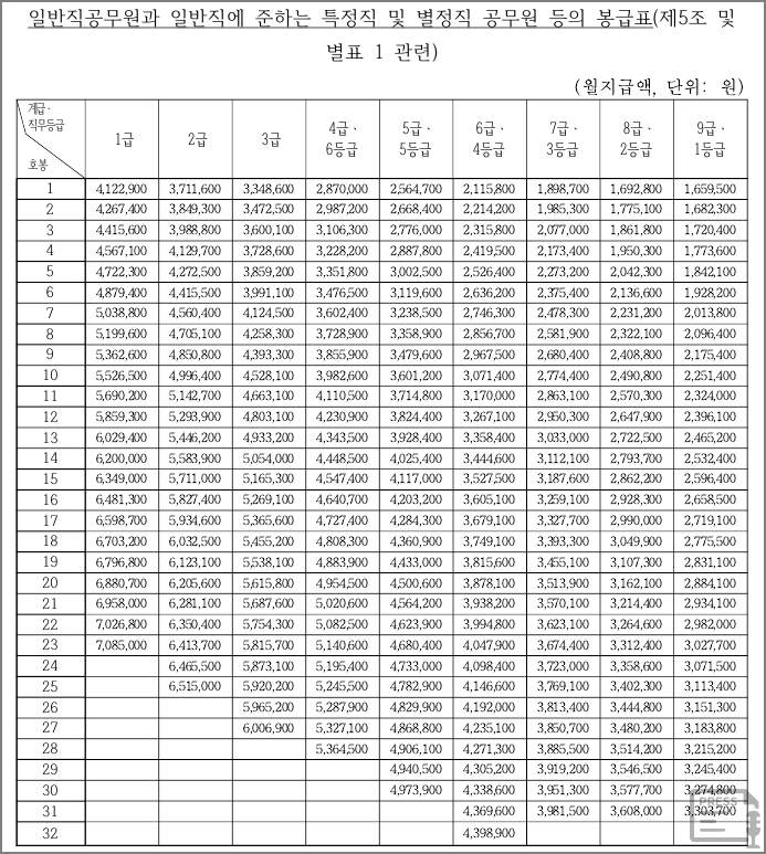 2021 공무원 봉급표입니다. 일반직공무원과 일반직에 준하는 특정직 및 별정직 공무원 등의 봉급표 입니다. 1급부터 9급까지의 월급표입니다. 호봉에 따라 금액은 차이가 있습니다. 9급 1호봉은 1,659,500원입니다.