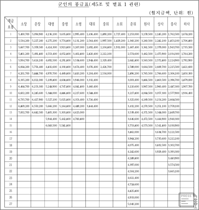 2021년 군인 봉급표입니다. 군인 계급은 하사, 중사, 상사, 원사, 준위, 소위, 중위, 대위, 소령, 중령, 대령, 준장, 소장 등이 있습니다. 참고로, 이등병 459,100원, 일등병 496,900원, 상등병 549,200원, 병장 608,500원입니다. 기타 자세한 봉급은 파일을 확인해보세요.