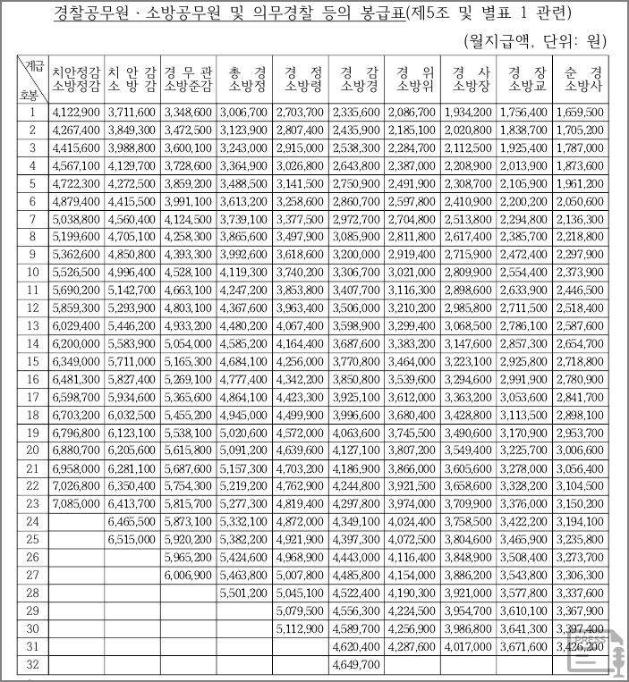 2021년 경찰공무원, 소방공무원 및 의무경찰 등의 봉급표입니다. 경찰의 직급은 순경, 경장, 경사, 경위, 경감, 경정, 총경, 경무관, 치안감, 치안정감이 있습니다. 소방공무원의 계급에는 소방사, 소방교, 소방장, 소방위, 소방경, 소방령, 소방정, 소방준감, 소방감, 소방정감이 있습니다.
