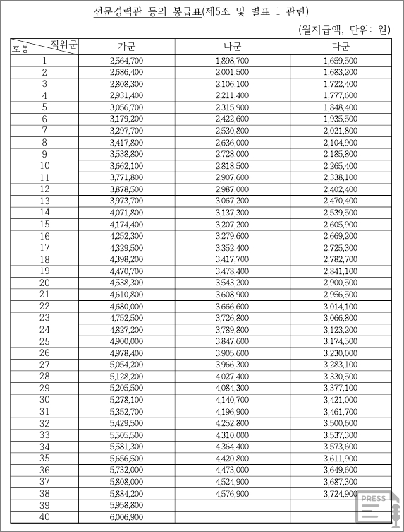 2021년 전문경력관 등의 봉급표입니다. 전문경력관은 가군, 나군, 다군의 직위가 있습니다. 역시 호봉에 따라 급여는 차이가 있습니다. 다군 1호봉은 1,659,500원입니다.
