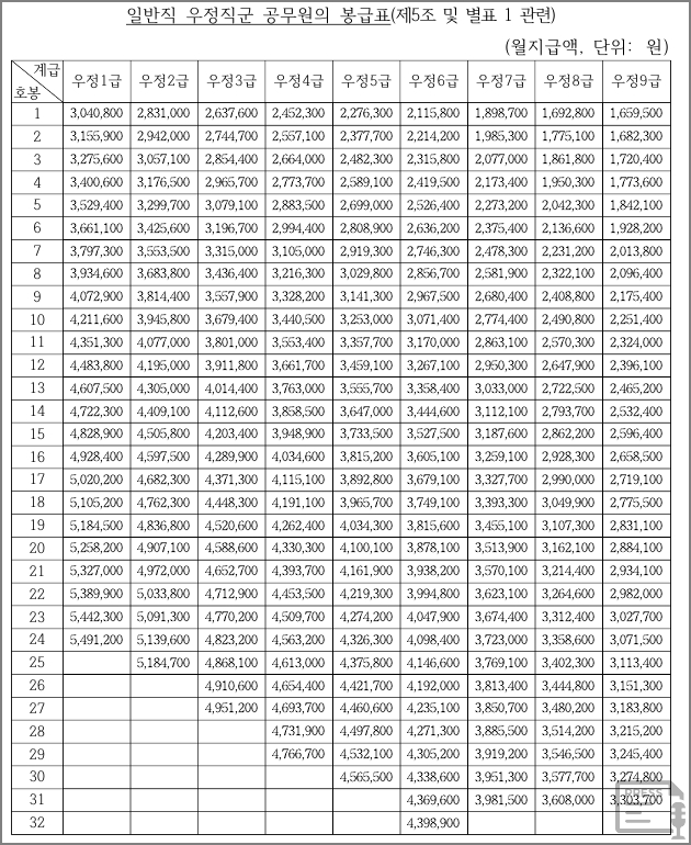 일반직 우정직군 공무원의 봉급표 입니다. 우정직은 우정1급부터 우정9급까지 계급이 있습니다. 일반직공무원의 그것과는 조금 차이가 있습니다. 우정9급부터 우정6급까지는 일반직공무원과 직급체계가 비슷합니다. 하지만, 우정5급부터는 조금씩 다릅니다.