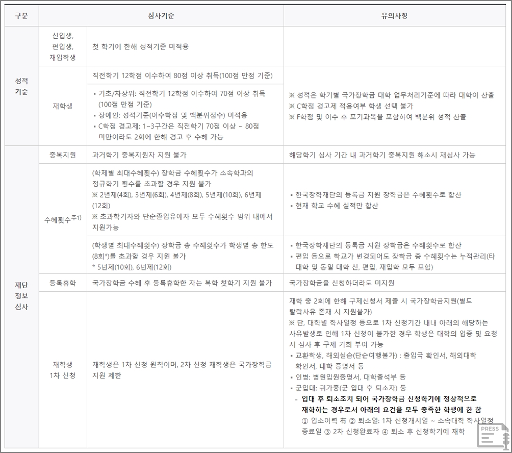 대학생 기준 직전 학기 12학점 이상 이수자로 100점 만점의 80점(B 학점) 이상의 성적이어야 합니다. 기초계층, 차상위계층의 경우는 100점 만점의 70점(C 학점) 이상이면 됩니다.