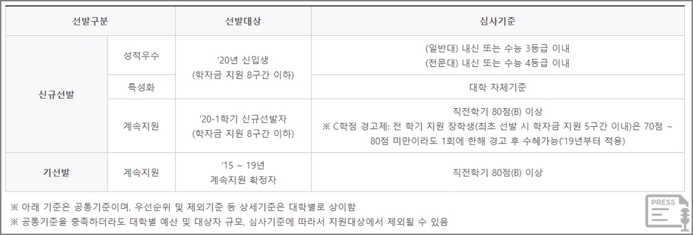 대학생 기준 직전 학기 12학점 이상 이수자로 100점 만점의 80점(B 학점) 이상의 성적이어야 합니다. 기초계층, 차상위계층의 경우는 100점 만점의 70점(C 학점) 이상이면 됩니다.