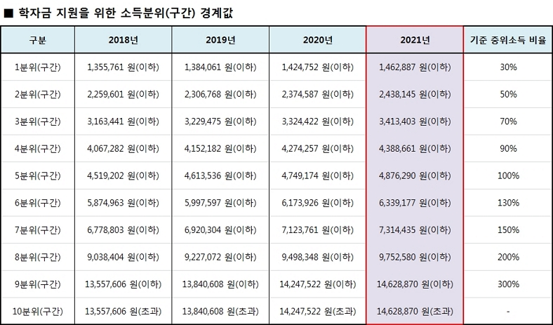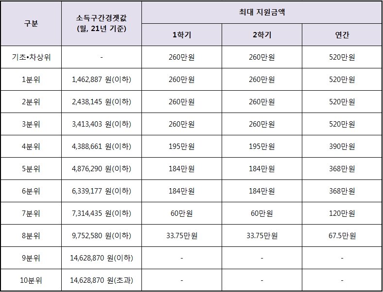 국가장학금은 소득 분위별로 학기당 등록금을 초과하지 않는 범위 내에서 일정액을 지원하고 있습니다. 소득분위 구간이 8구간 이하여야 합니다. 오늘은 국가장학금 소득분위 경계값 및 지원금액에 대해서 알아보도록 하겠습니다.