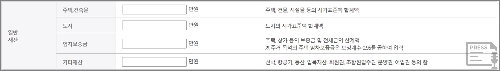 일반재산은 재산 종류별로 입력을 합니다. 주택과 건축물, 토지, 임차보증금, 기타재산으로 입력합니다. 주택 건물 시설물 등의 시가표준액의 합계액, 토지의 시가표준액 합계액, 주택 상가 등의 보증금 및 전세금의 합계액, 선박 항공기 회원권 어원권 등의 합계는 기타재산에 입력을 합니다.