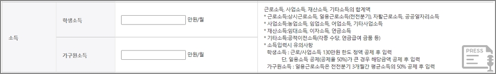 소득은 학생소득과 가구원소득을 각각 나누어서 입력을 합니다. 학생소득의 경우 공제되는 금액이 있기 때문에 꼭 분리해서 작성을 하여야 합니다. 근로소득, 사업소득, 재산소득, 기타소득의 합계액으로 작성합니다.