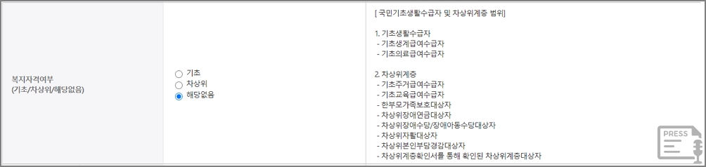 국민기초생활수급자 및 차상위계층 범위를 선택합니다. 기초생활수급자, 차상위계층인 경우 선택하시면 됩니다. 해당사항이 없는 경우 해당 없음에 체크를 합니다.