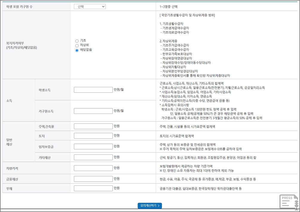 소득인정액 모의계산기는 한국장학재단에서 제공을 하고 있습니다. 어떻게 입력을 해야 하는지 순서대로 살펴보겠습니다.