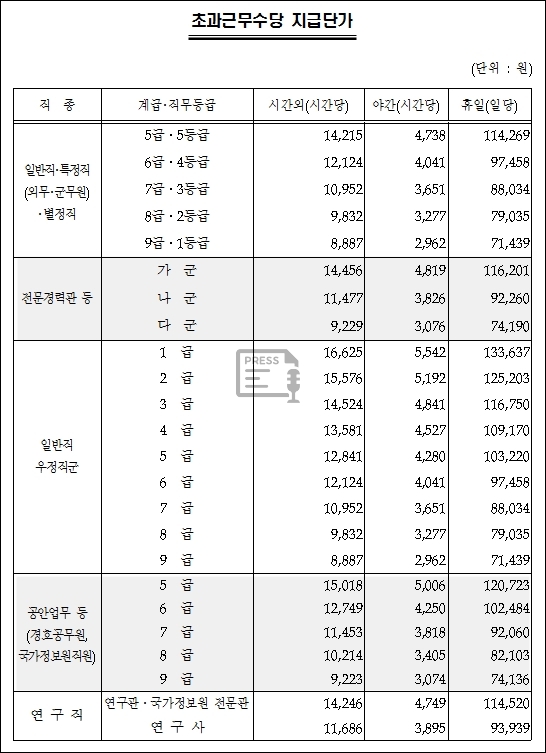 2. 공무원 초과근무수당 지급단가