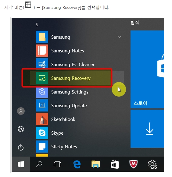 1. 작업표시줄의 시작 버튼을 클릭 후 [Samsung Recovery]를 실행합니다.