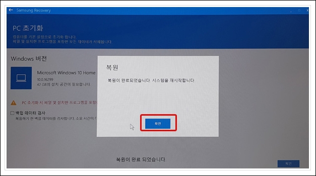 7. 복원 완료 안내가 나타나면 '확인' 을 클릭하세요. 시스템이 재시작 하게 됩니다.