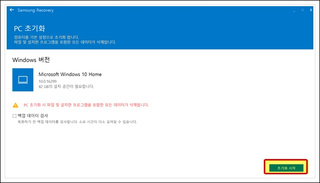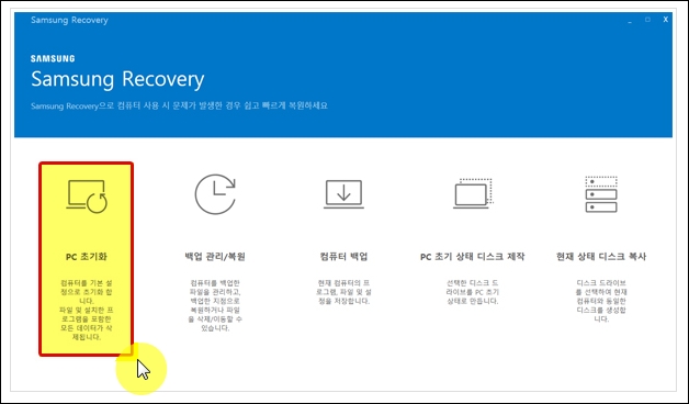 Samsung Recovery 복구 프로그램을 통해 초기화 또는 복원을 하게 되면 해당 시점 이후에 저장한 모든 데이터 및 사용자가 별도로 설치한 애플리케이션 등이 모두 삭제가 됩니다. 따라서, 매우 중요한 파일, 사진 등 자료 등은 미리 백업 받아서 외부 저장장치에 보관해 두시기 바랍니다. 한번 사라진 자료는 다시 돌아오지 않습니다.