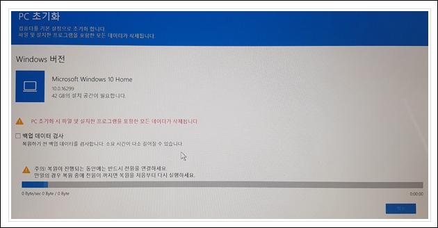 복원이 진행되는 동안에는 반드시 전원을 연결해 놓으세요. 만일 복원 중에 전원이 꺼지면 복원을 처음부터 다시 시작을 하시기 바랍니다.