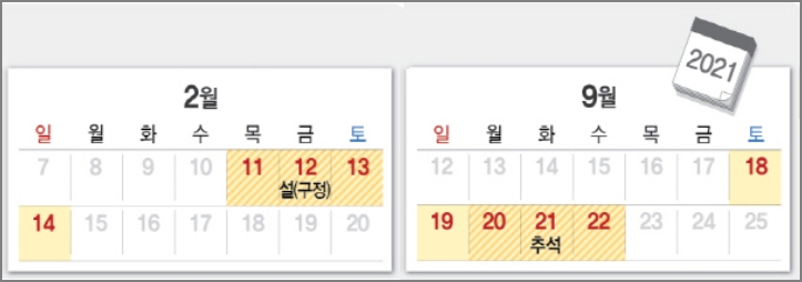 2021년 설날은 2월 12일, 추석은 9월 21일입니다.