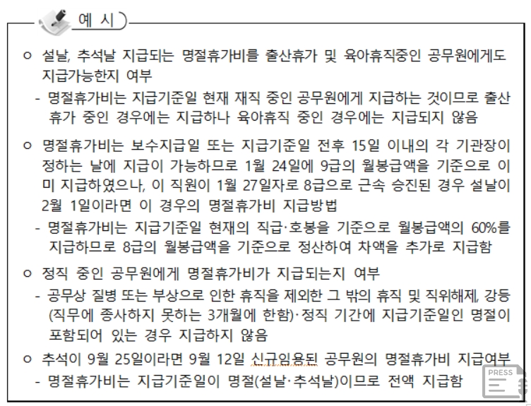 설날이나 추석 등이 있는 달에 인사가 나는 경우에는 지급기준일을 기준으로 결정을 합니다. 즉, 설날과 추석날에 신규채용, 퇴직, 승진, 승급 등 각종 임용이 되면 지급기준일에 따라 명절휴가비 금액이 바뀌게 됩니다.