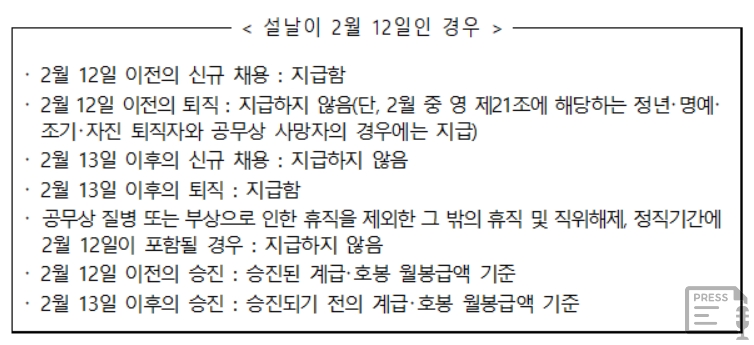 설날이나 추석 등이 있는 달에 인사가 나는 경우에는 지급기준일을 기준으로 결정을 합니다. 즉, 설날과 추석날에 신규채용, 퇴직, 승진, 승급 등 각종 임용이 되면 지급기준일에 따라 명절휴가비 금액이 바뀌게 됩니다.